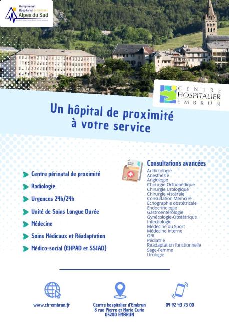 Centre hospitalier d'Embrun, 8 bd Pierre et Marie Curie. Renseignements 04.92.43.73.00 ou www.ch-embrun.fr