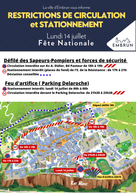 Afin d’assurer le bon déroulement des festivités et la sécurité de toutes et tous, des restrictions temporaires de circulation et de stationnement seront mises en place dans les zones concernées par les manifestations.