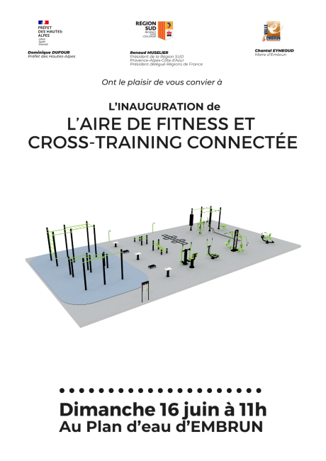 11 juin 2024 Sports INAUGURATION DE L’AIRE DE FITNESS ET CROSS-TRAINING CONNECTÉE Dimanche 16 juin à 11h Au plan d'eau d'Embrun Infos pratiques Mairie de Puy-Sanières 04 92 43 38 88 Nous contacter A ne pas manquer Actualités Evénements Source : Ville Embrun