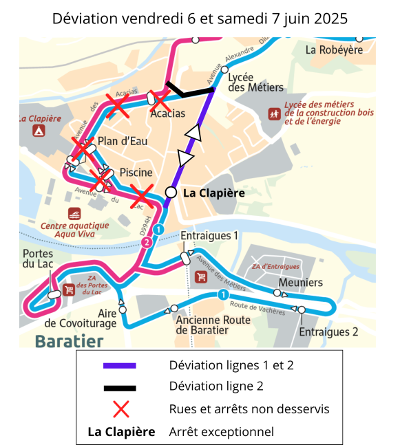 Vendredi 6 et samedi 7 juin, les arrêts Acacias, Plan d’eau et Piscine ne sont pas desservis, toujours en lien avec l’Outdoormix festival. Se reporter aux arrêts Lycée des Métiers (ligne 1) ou La Clapière (lignes 1 et 2) (sur plan ci-dessus).