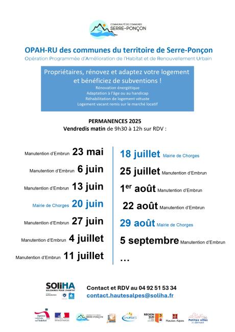 Des permanences régulières seront mises en place à partir du 23 mai 2025 sur RDV dans les locaux de la Manutention à Embrun et dans les locaux de la mairie de Chorges. Le planning de ces permanences vous sera présenté lors de la réunion publique, et est disponible sur les sites internet des communes et de la Communauté de Communes de Serre-Ponçon.