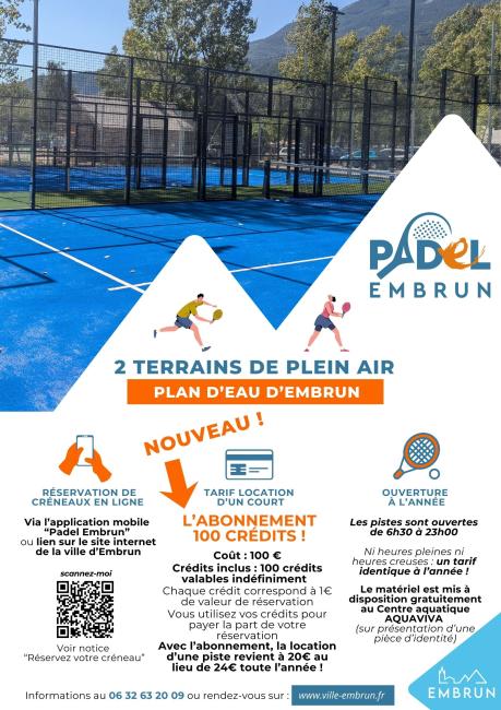 Infos sur le site de la Ville d'Embrun & réservation via l’application Padel Embrun: https://www.ville-embrun.fr/terrains-padel