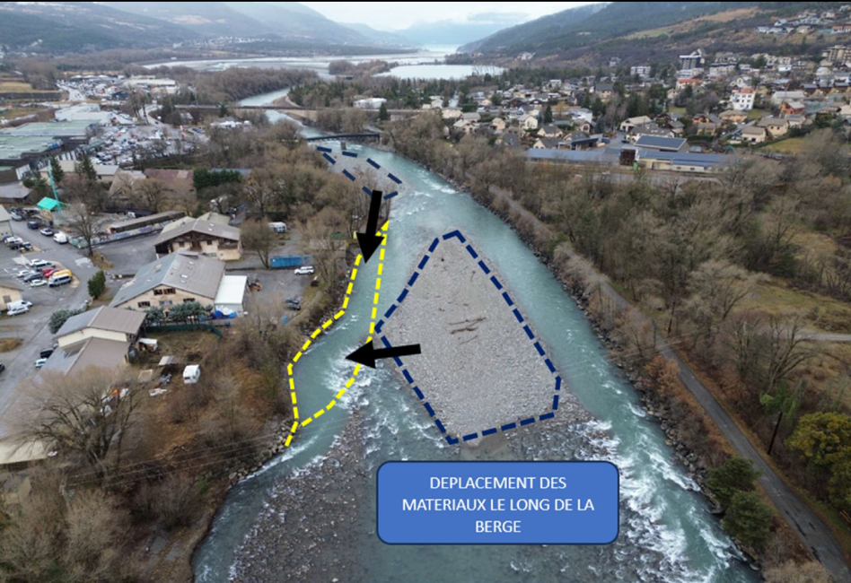 Ces travaux, financés par la Communauté de communes de Serre-Ponçon au titre de la compétence GEMAPI (Gestion des Milieux Aquatiques et Prévention des Inondations), visent à limiter l’érosion du talus côté rive gauche près des bâtiments et à réduire les contraintes sur la route-digue RD467 côté rive droite.